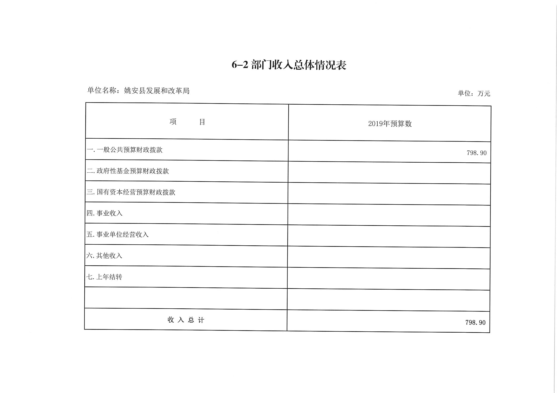 2019年部门财务总收入798.90万元,其中:一般公共预算财政拨款798.90万元,政府性基金预算财政拨款0万元,国有资本经营预算财政拨款0万元,事业收入0万元,事业单位经营收入0万元,其他收入0万元,上年结转0万元。