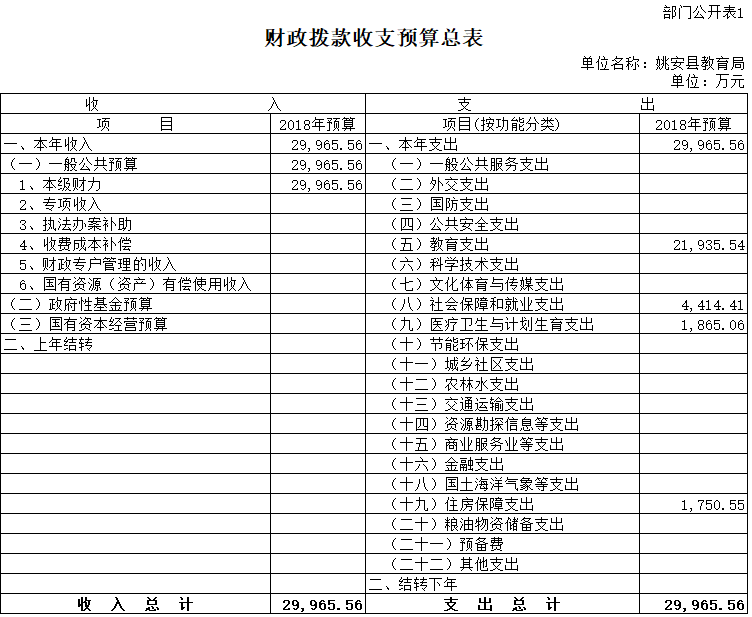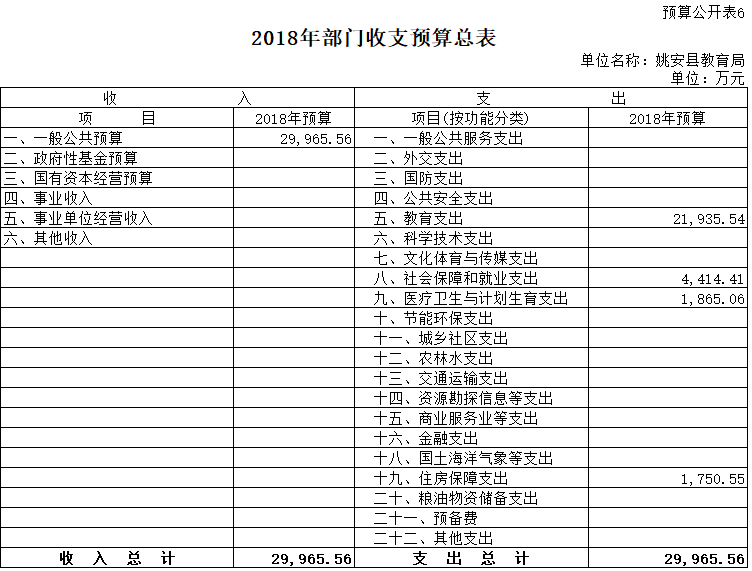 姚安县教育局2018年财政拨款预算总收入29965.56万元,其中:本级财力29965.56万元。2018年财政拨款预算总支出29965.56万元。按支出功能科目分类,支出列“ 205类01款01项”预算支出183.56万元,主要反映教育局机关人员、办公支出;“ 205类02款01项”预算支出437.03万元,主要反映县幼儿园人员、办公支出;“ 205类02款02项”预算支出10880.35万元,主要反映全县小学教育人员、办公支出;“ 205类02款03项”预算支出6322.25万元,主要反映全县初中教育人员、办公支出;“ 205类02款04项”预算支出3275.85万元,主要反映姚安一中人员、办公支出;“ 205类03款04项”预算支出395.04万元,主要反映姚安县职业高级中学人员、办公支出;“ 205类08款01项”预算支出431.73万元,主要反映姚安县教师进修学校人员、办公支出;“ 205类99款99项”预算支出9.73万元,主要反映人员、办公支出;“ 208类05款02项”预算支出1382.71万元,主要反映离退休人员改革性补贴支出;“ 208类05款05项”预算支出2917.58万元,主要反映机关事业单位养老保险支出;“ 208类08款04项”预算支出38.77万元,主要反映中小学校临时人员经费支出;“ 208类08款99项”预算支出2.24万元,主要反映中小学校临时人员经费支出;“ 208类25款02项”预算支出0.12万元,主要反映弥兴中心学校李桂兰医疗补助经费支出;“ 208类27款02项”预算支出72.99万元,主要反映中小学校教职工工伤保险基金支出;“ 210类11款01项”预算支出12.44万元,主要反映机关单位医疗保险经费支出;“ 210类11款02项”预算支出1367.23万元,主要反映事业单位医疗保险经费支出;“ 210类11款03项”预算支出485.39万元,主要反映机关事业公务员医疗补助支出;“ 221类02款01项”预算支出1750.55万元,主要反映机关单位住房公积金经费支出。