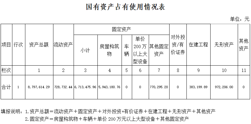 截至2019年12月31日,姚安县太平中心学校资产总额8,797,614.29元,其中,流动资产728,732.44元,固定资产6,713,475.96元,对外投资及有价证券0元,在建工程383,199.89元,无形资产972,206.00元,其他资产0元(具体内容详见附表)。与上年相比,本年资产总额减少865,687.92元,其中固定资产减少252,012.59元。处置房屋建筑物0平方米,账面原值0元;处置车辆0辆,账面原值0元;报废报损资产0项,账面原值0元,实现资产处置收入0元;出租房屋0平方米,账面原值0元,实现资产使用收入0元。