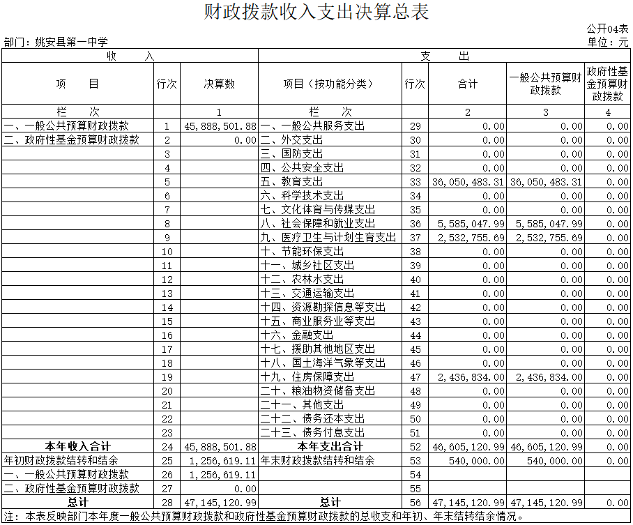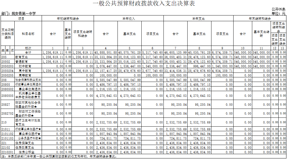 2017年一般公共预算财政拨款支出中,上年结转1256619.11元,其中基本支出结转0元,项目支出结转1256619.11元;本年收入45888501.88元,其中基本支出40570761.28元,项目支出5317740.6元、本年支出46605120.99元,其中基本支出40030761.28元,项目支出6574359.71元;本年年末结转和结余540000.00元,其中基本支出结转540000.00元,项目支出结转0元。