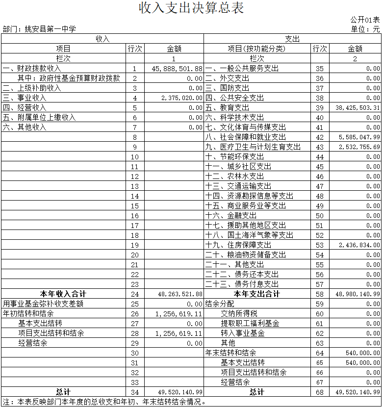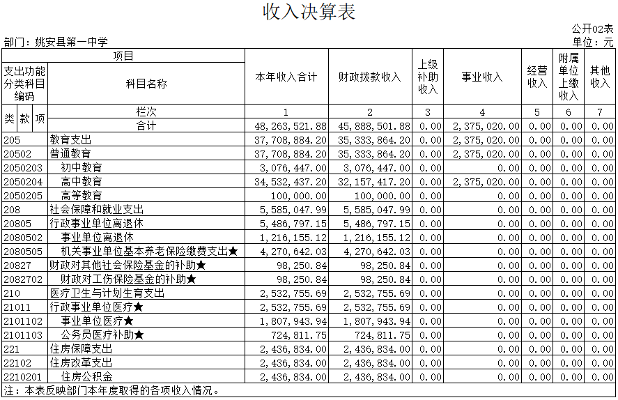 “收入决算表”中本单位总收入为48263521.88元,来自财政拨款收入45888501.88元,事业收入2375020元,其他收入0元。