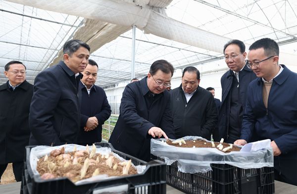 江川区九溪镇六十亩村种植百合花近30年,2023年村党总支引入曙禾花卉公司共建鲜花产业园,促进传统种植转型升级,通过引培优质种球、发展无土栽培、建智能冷库、统一市场营销,亩均产值从4万元左右提升到14万元。在大棚种植区,王宁同基层干部、花农、农科人员、企业负责人深入交谈,勉励企业示范带动更多花农突破传统种植模式瓶颈,共享产业增值红利。强调要全面提升我省花卉产业发展能级,瞄准世界一流目标,从种业端、种植端、市场端一个环节一个环节研究谋划,着眼未来加强种质研发,以科技赋能、以品牌开拓,创新更多联农带农机制,让“美丽产业”成为群众可持续增收致富的“幸福产业”。
