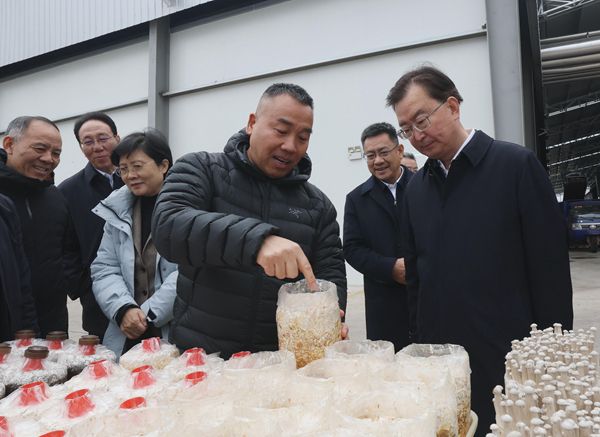1月8日,王宁在南华县汇菇源生物科技公司调研人工菌种培育、菌棒生产、精深加工等情况。