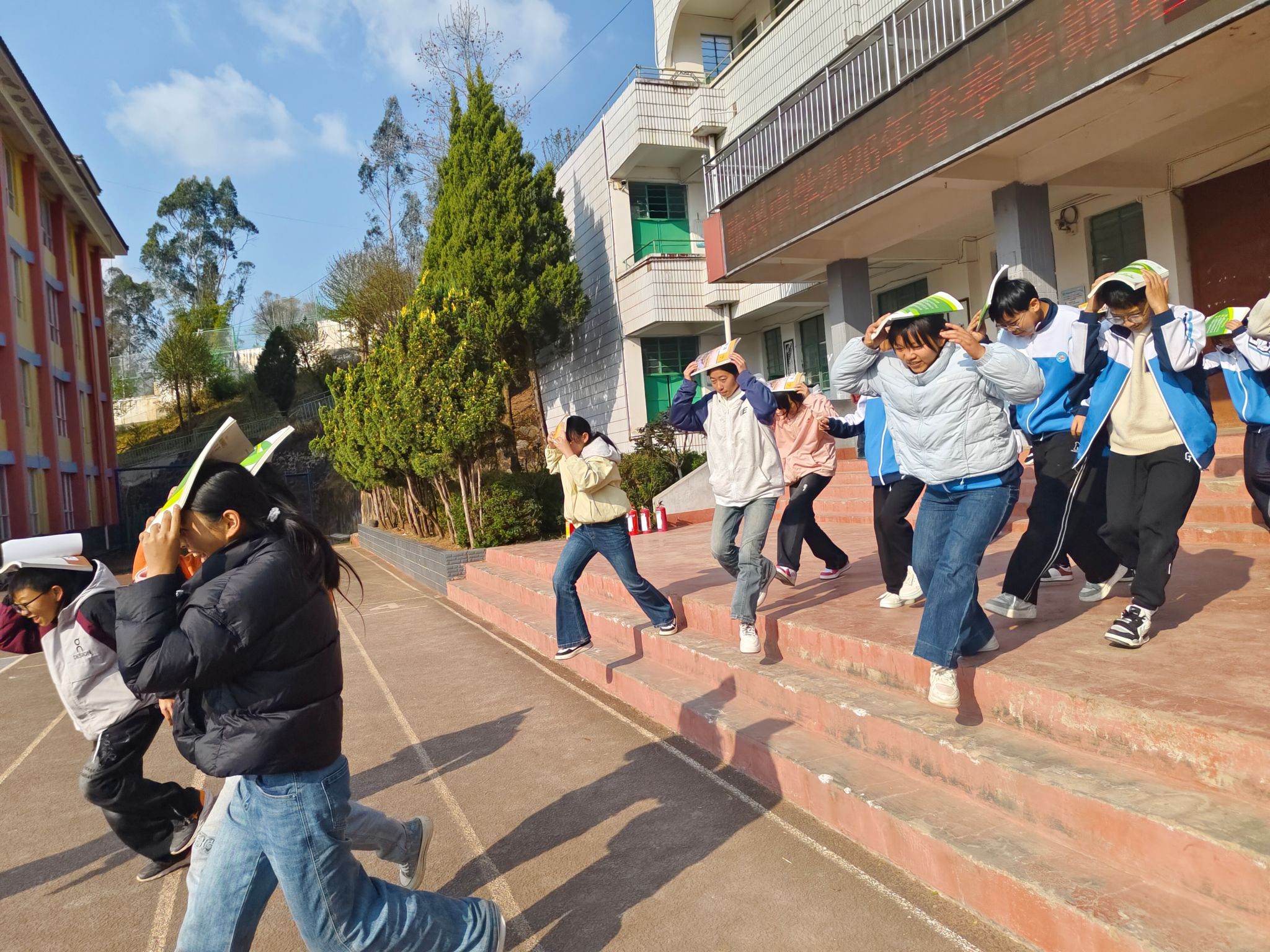 随着演练指令的下达,地震避险疏散演练率先启动。上午九点半,警报声响起,各班正在上课教师迅速组织学生就地躲避在课桌下或墙角,随后按照预定疏散路线,在各楼道负责疏散的教师引导下,全体学生有序、快速地撤离至安全区域。紧接着进行的消防疏散演练中,师生们同样反应迅速,配合默契,整个过程紧张有序、安全高效。