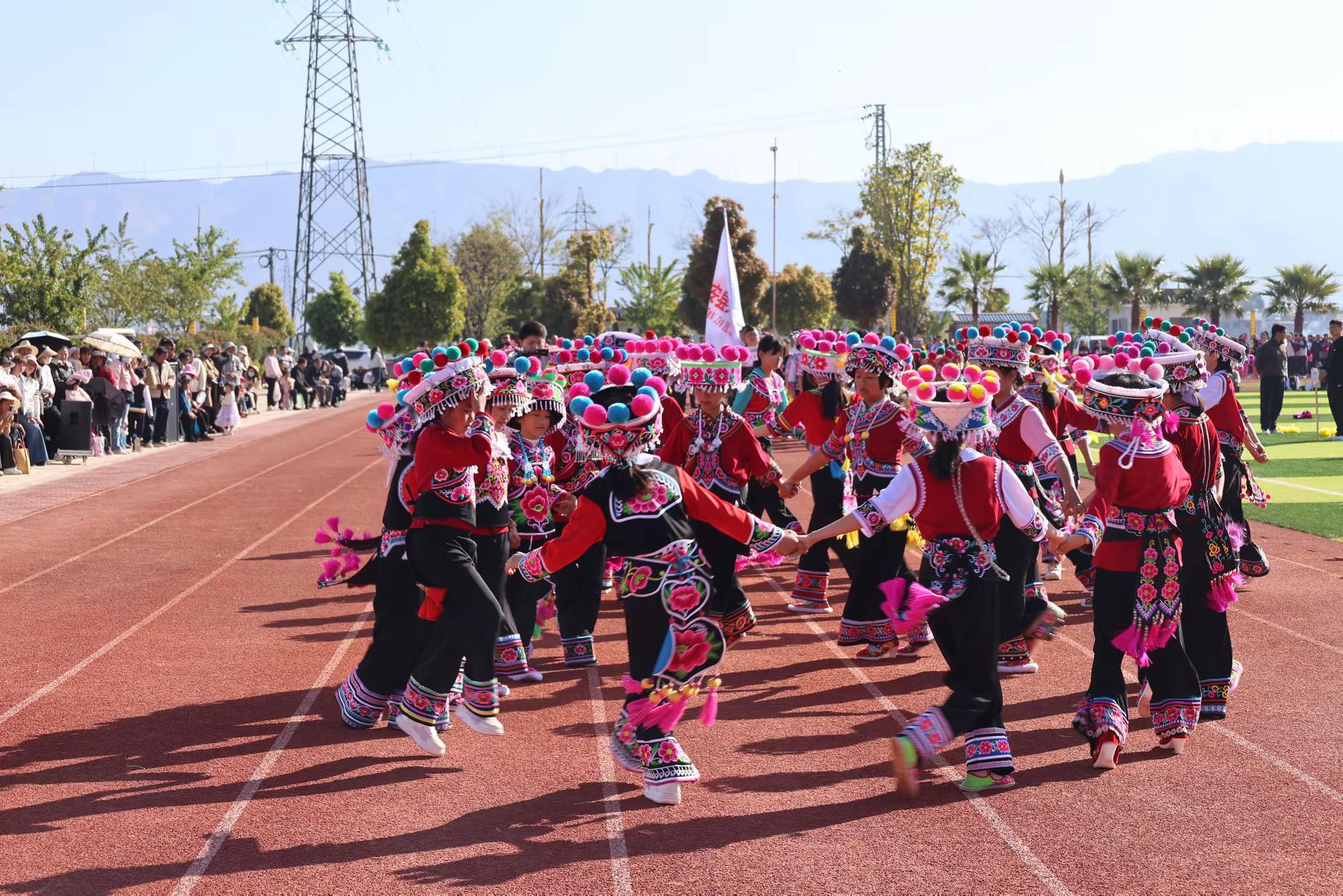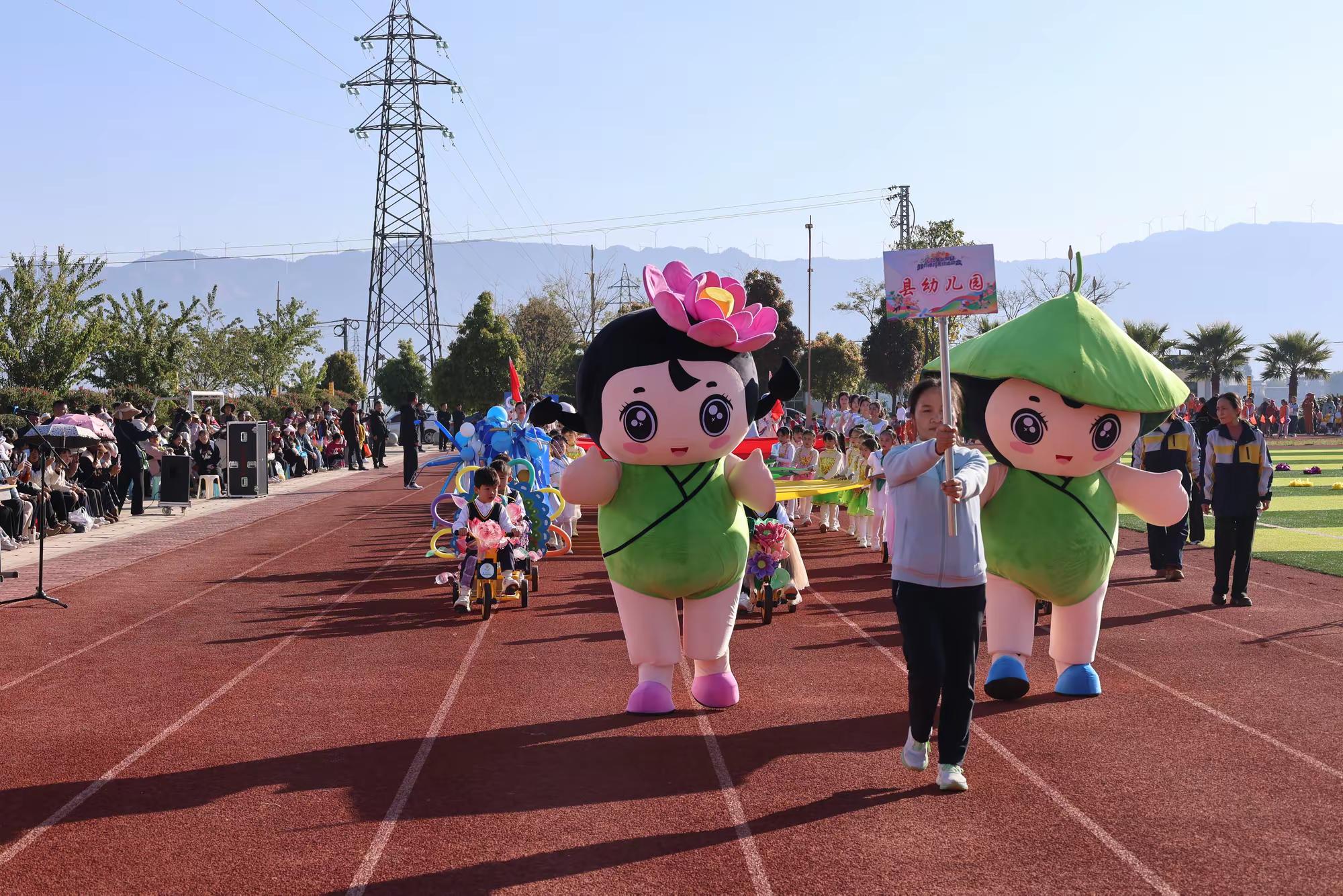 开幕式现场气氛热烈,精彩纷呈。来自全县教育体育系统的22支代表队、1500余名队员参与了盛大的入场式与特色展演。各幼儿园代表队生动展示了独具特色的办学成果与师幼风采;各乡镇中心小学师生代表团身着绚丽的彝族服饰与传统服装,呈现了富有地域风情的民族特色表演;各初级中学及县职高代表团也带来了形式多样、活力四射的节目,其中县职高的舞龙舞狮表演尤为引人注目,将现场气氛推向高潮。在学校特色入场展演结束后,全体代表团成员共同演绎了集体舞《最好的舞台》,充分展现了全县师生团结一心、昂扬向上的精神风貌。