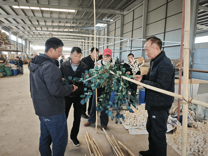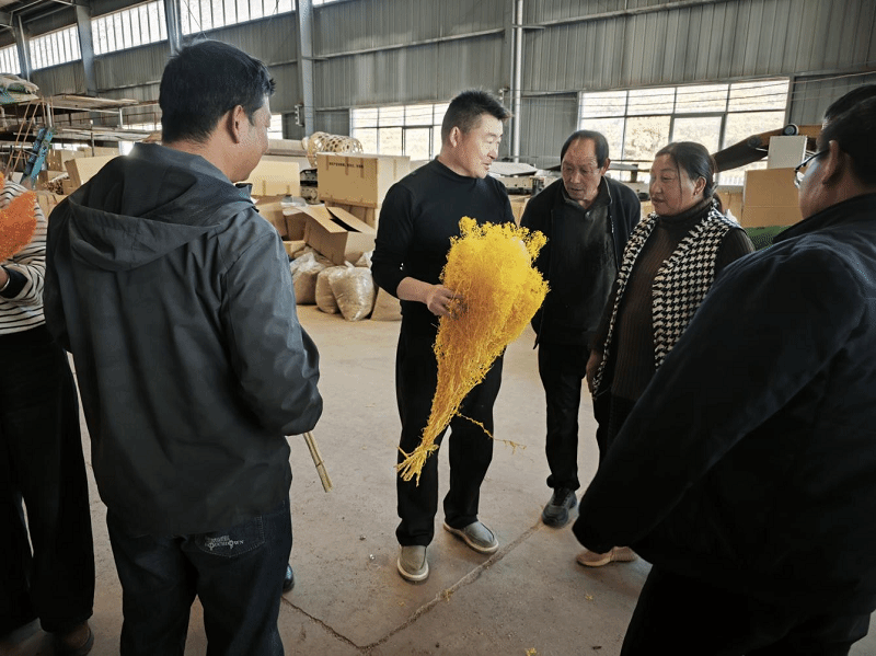 产业振兴,党建为魂。官屯镇始终紧跟县委部署,将组织工作与发展花卉新质生产力紧密结合,深知“要富口袋先富脑袋,要兴产业先找路径”。针对永生花市场需求缺口,以及群众“想种无方向、怕种无销路”的顾虑,镇党委精准对接姚安县彼岸花工艺品厂,搭建“党总支+企业+农户”合作桥梁——由各村党总支牵头组织种植,企业提供种植标准、技术指导和保底收购,全力推广永生花专用草花种植产业。为让群众吃透种植技术、摸清合作模式,各村党总支组建“党员先锋队”“技术服务队”,分批组织党员干部、种植大户、致富能手及有意向的群众,赴姚安县彼岸花工艺品厂开展实地学习交流。在永生花加工车间和示范种植区,大家围着技术专家问标准、跟着企业技术员学技巧,从草花品种选择、田间水肥管理、病虫害绿色防控,到采收时间节点、品质验收标准,再到合作收购流程,逐一破解产业发展中的“堵点”“难点”,为规模化种植筑牢基础。
