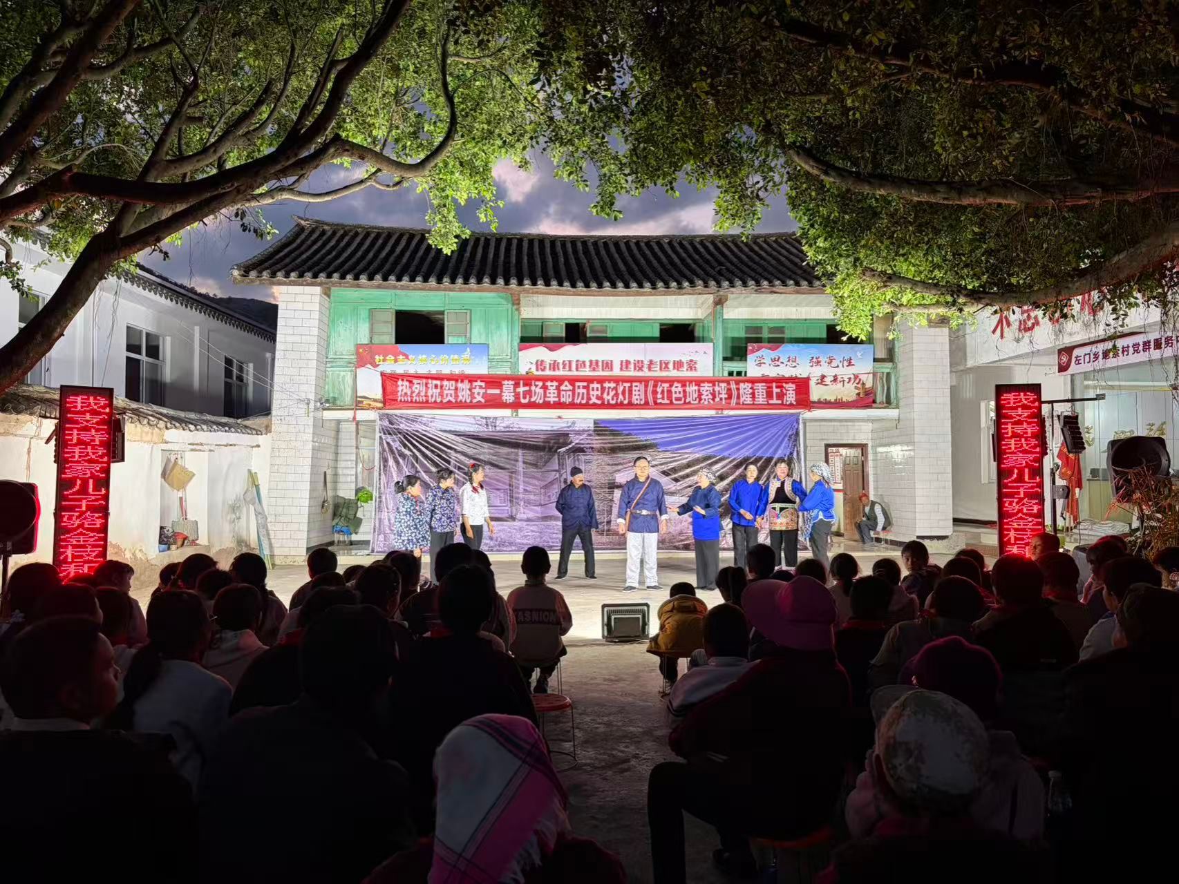 地索村是姚安县第一个党支部成立的地方,也是“边纵”八支队重要活动区域,这片热土承载着厚重的革命历史,留下了革命先辈浴血奋战、一心为民的光辉足迹。此次演出,县农戏协会立足地索真实革命史实,精心打磨《红色地索坪》剧目,全景式展现了地索地区革命武装发展、基层党组织建设、群众投身革命斗争的峥嵘历程,剧目巧妙融入姚安方言、彝族梅葛等本土文化元素,既贴合乡村实际,又极具历史厚重感与艺术感染力。