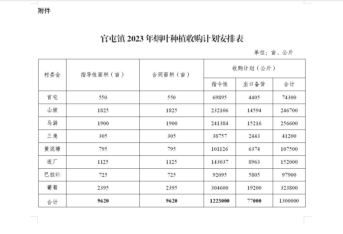 附件:官屯镇2023年烟叶种植收购计划安排表