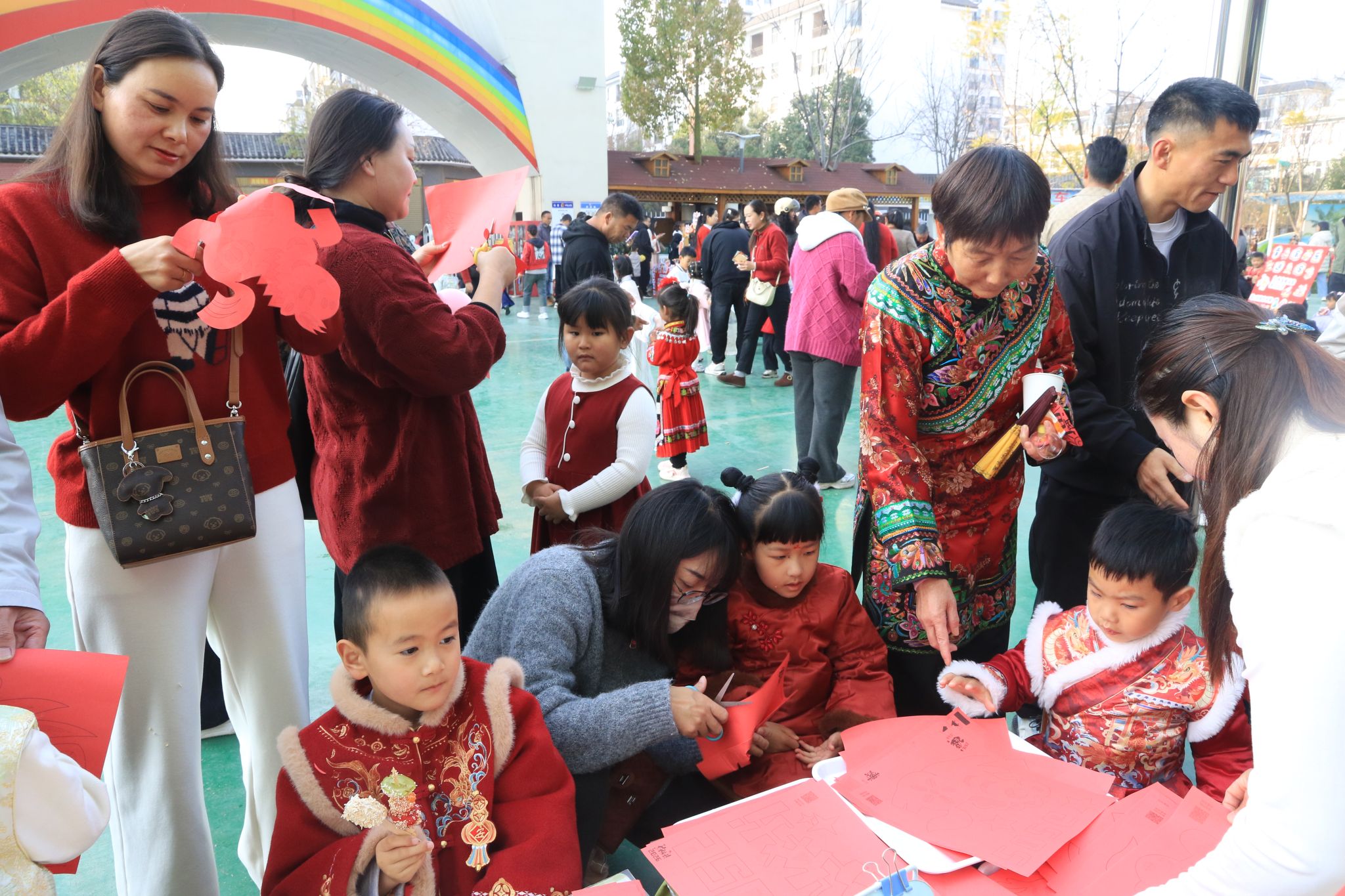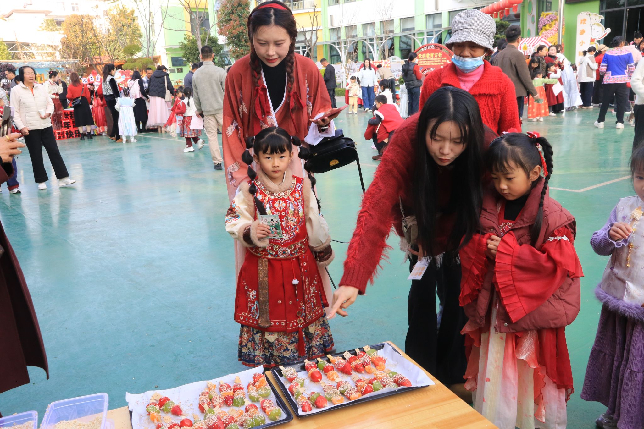 在2026年春季学期开学之际,一场以“逛庙会·扬传统·品年味”为主题的迎新游园活动在姚安县幼儿园热闹开启。本次活动将传统文化融入童趣体验,让孩子们在欢声笑语中感受中华民俗的独特魅力及新学期的活力。活动以家长带领孩子一起体验“逛庙会”摊位活动的形式展开,品花茶、制作糖葫芦、剪窗花、非遗拓印、投壶、吸福、抽盲袋等。庙会现场,年味十足。各班教师精心布置了特色摊位,孩子们手持游园卡,穿梭于各个体验区,沉浸式感受传统文化的温度。