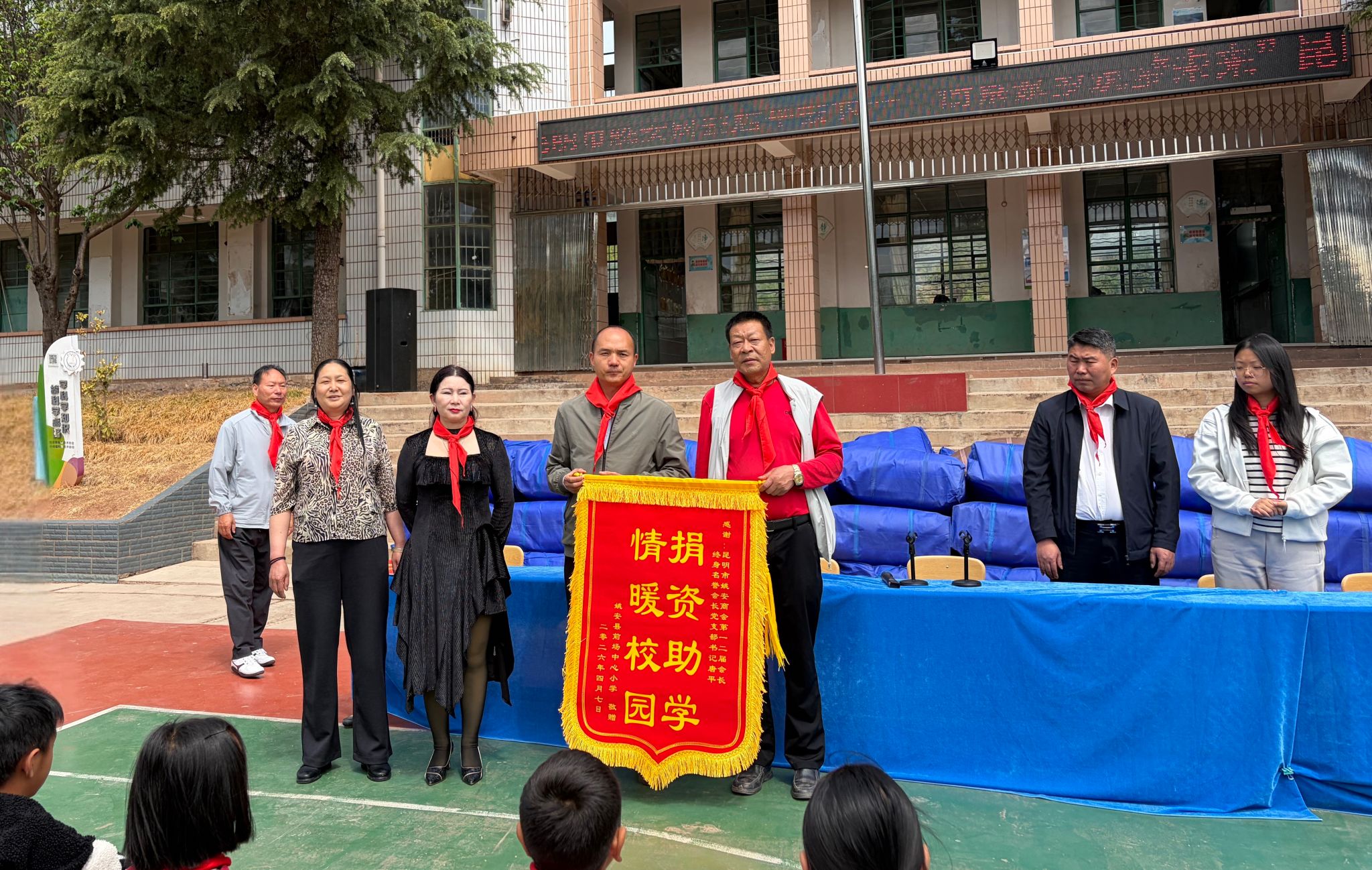 4月7日,姚安县前场中心小学举行昆明市姚安商会爱心捐赠仪式。昆明市姚安商会会长唐平及商会代表、姚安县教育体育局党组书记、局长张建文、前场镇政府副镇长向思渝出席活动,学校全体师生参加仪式。