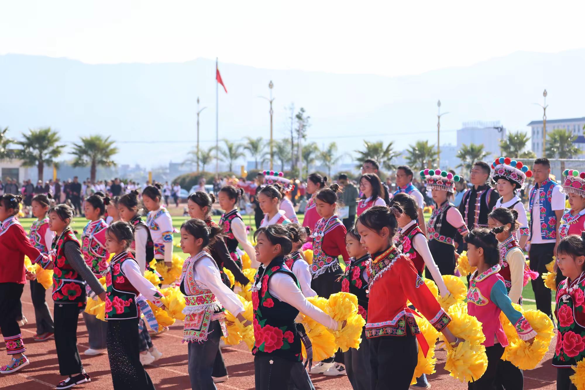 开幕式现场气氛热烈,精彩纷呈。来自全县教育体育系统的22支代表队、1500余名队员参与了盛大的入场式与特色展演。各幼儿园代表队生动展示了独具特色的办学成果与师幼风采;各乡镇中心小学师生代表团身着绚丽的彝族服饰与传统服装,呈现了富有地域风情的民族特色表演;各初级中学及县职高代表团也带来了形式多样、活力四射的节目,其中县职高的舞龙舞狮表演尤为引人注目,将现场气氛推向高潮。在学校特色入场展演结束后,全体代表团成员共同演绎了集体舞《最好的舞台》,充分展现了全县师生团结一心、昂扬向上的精神风貌。